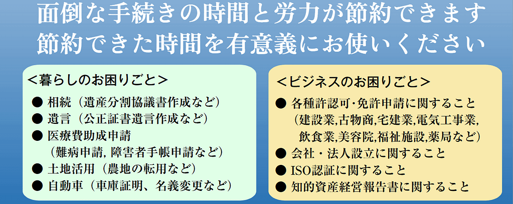 相続、遺言書作成、許認可申請、難病申請などのお客様のご相談に対し