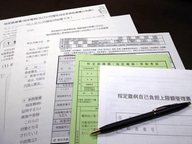指定難病の医療費助成申請に必要な書類等は非常に煩雑で、医療機関や市町村役場の住民課・税務課から必要書類(臨床調査個人票・住民票や課税証明等)を取得して都道府県や政令市等の保健所に申請します。